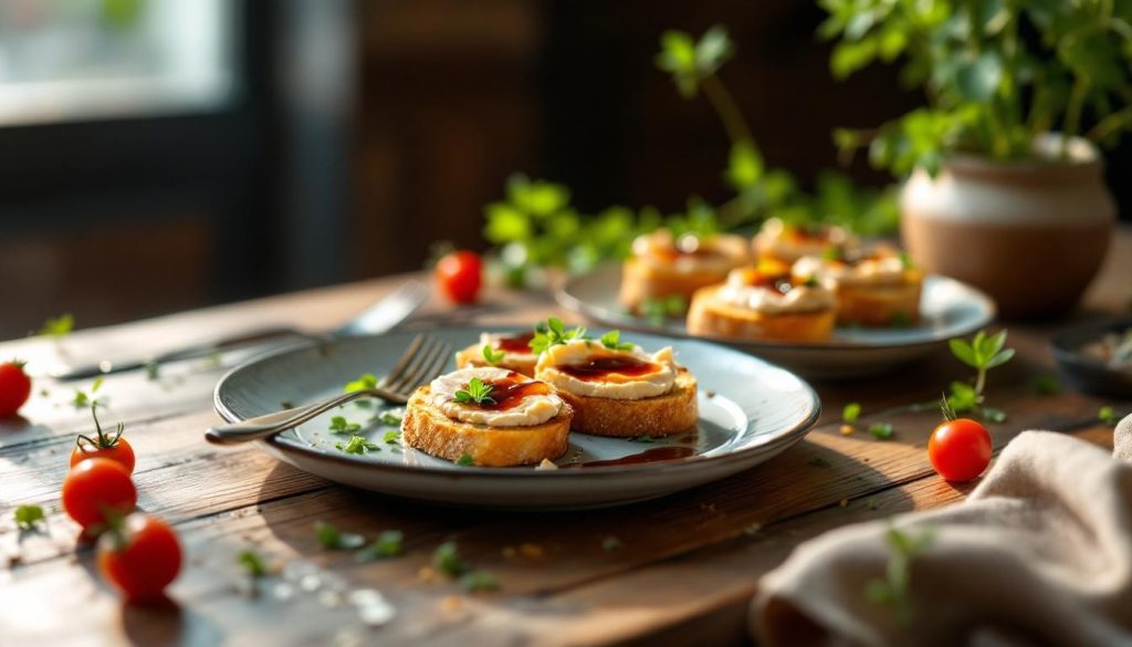 Un filet de chutney de figues ou quelques dés de pommes caramélisées apportent un supplément d’âme aux toasts. Pensez également à jouer la carte du sucré-salé avec une gelée de coing, un duo qui intrigue souvent les convives et plaît à coup sûr.